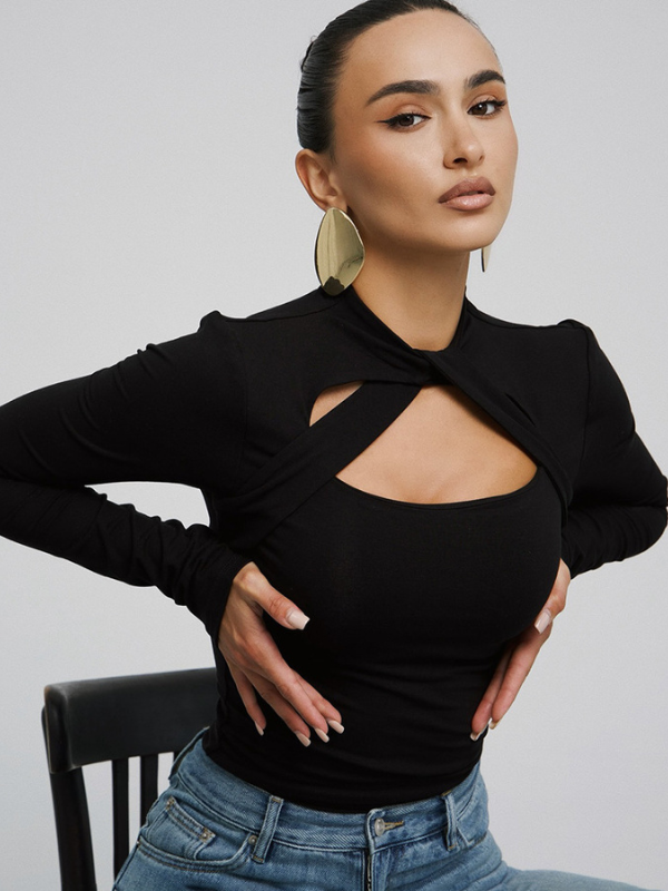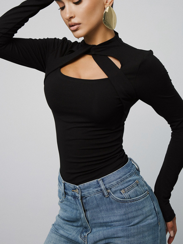 ZASUWA Female Sexy Crisscross Knot Round Neck Long-Sleeve Stylish Slim-Fit Bodysuits - Black / S is backordered and will ship as soon as it is back in stock.