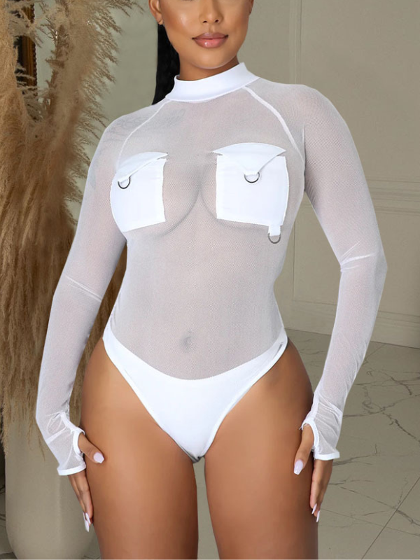 ZASUWA Female Sexy Mesh Pocketed Sheer Long-Sleeve Bodysuit - White / S is backordered and will ship as soon as it is back in stock.