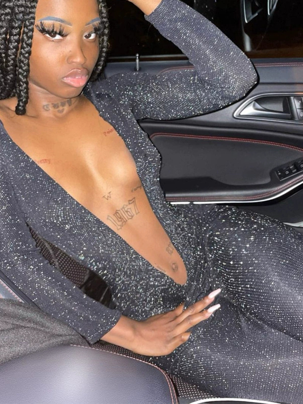 ZASUWA Female Fashion Silver Thread Shiny V-Neck Long-Sleeve Sexy Open-Back Jumpsuit